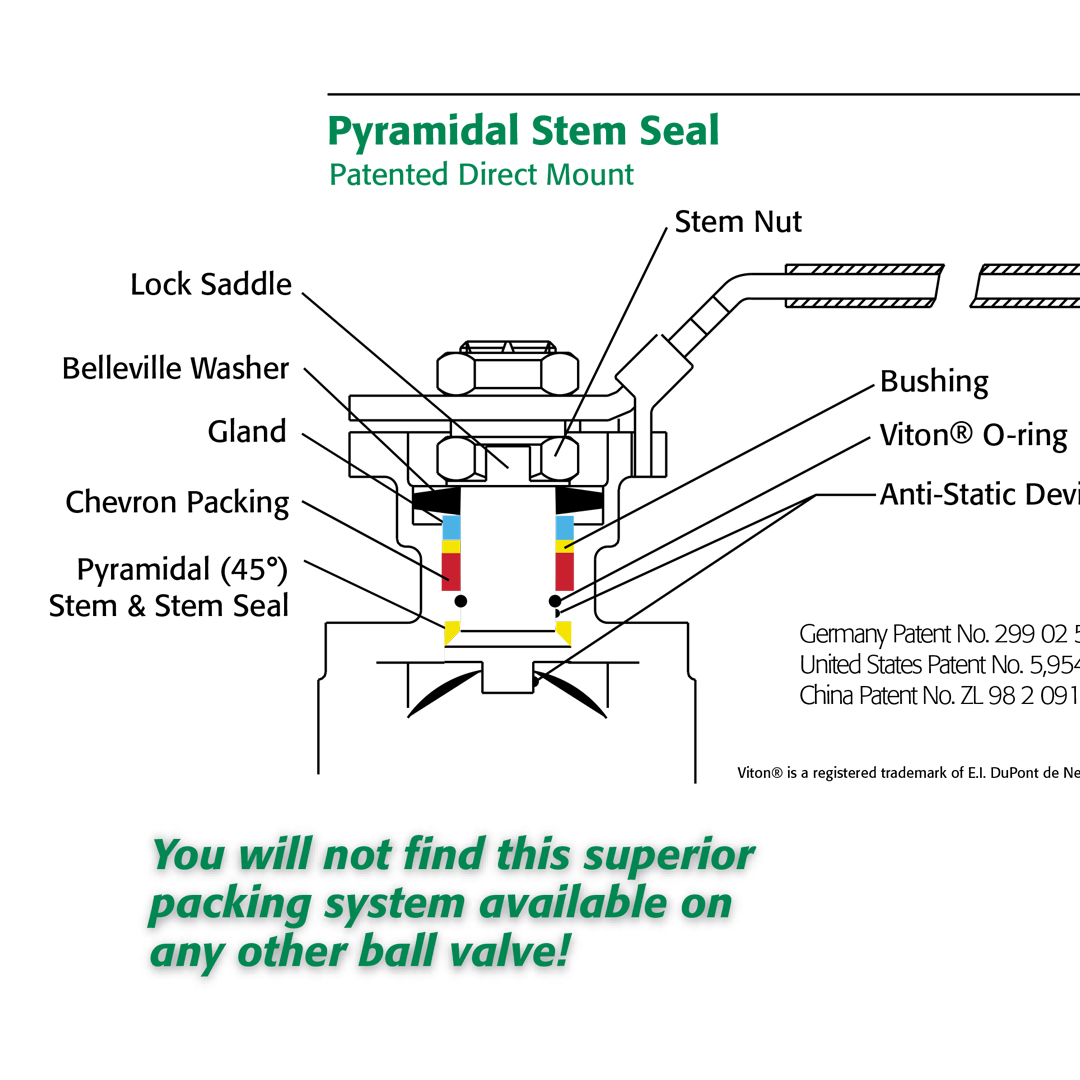 The TRIAC TA-Luft certified valves employ a unique live-loaded pyramidal stem packing system. This features a patented 45° pyramidal stem and stem seal with Belleville washers and PTFE chevron style stem packing, protecting against stem leaks experienced with ordinary ball valves.
